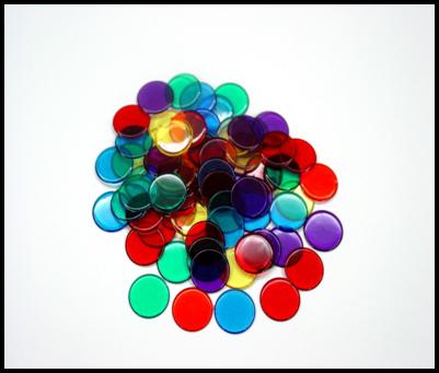 مجموعة من القطع الدائرية الملونة : تتكون من ستين دائرة صغيرة بستة ألوان ( أحمر _ أصفر _ أزرق _ أخضر _ برتقالي _ بنفسجي ) .والشكل التالي يوضح الدوائر الملونة .