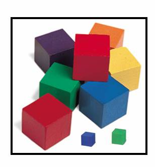 مجموعة من المكعبات مختلفة الألوان (أحمر - أصفر - أزرق - أخضر - بنفسجي - برتقالي ) ومختلفة الأحجام( كبيرة – صغيرة ) . والشكل التالي يوضح بعضاً من المكعبات الخشبية .