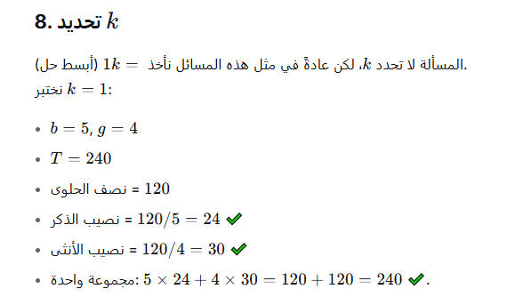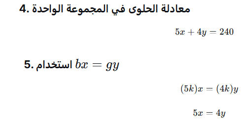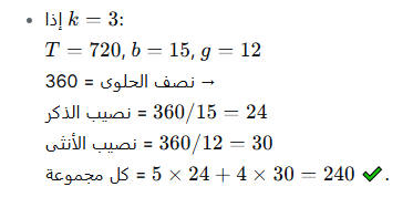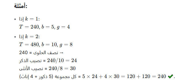 اشترت معلمة كمية من الحلوى وقسمت نصفها بالتساوي بين ٢٠ طالبًا ذكرًا، والنصف الآخر بالتساوي بين ١٦ طالبة أنثى.