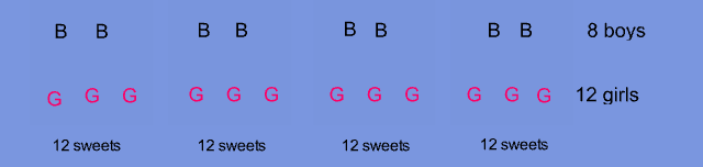من المعطيات أن كل 2 من الذكور و 3 من الاناث كان نصيبهم 12 قطعة حلوى