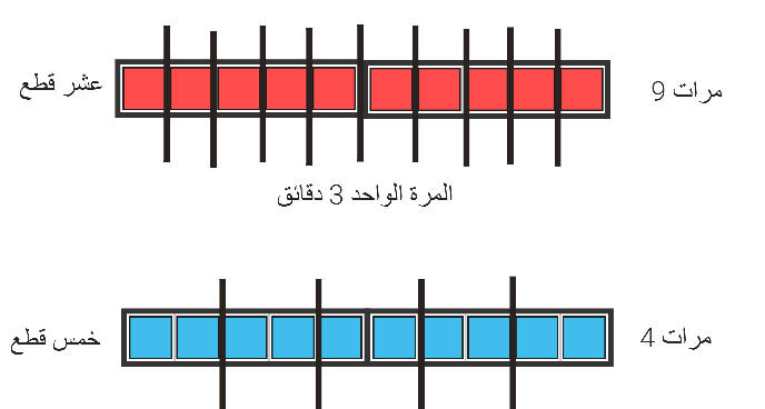 المرة الواحدة تحتاج 3 قائق10 قطع تحتاج 9 مرات قطع = 27 دقيقة.